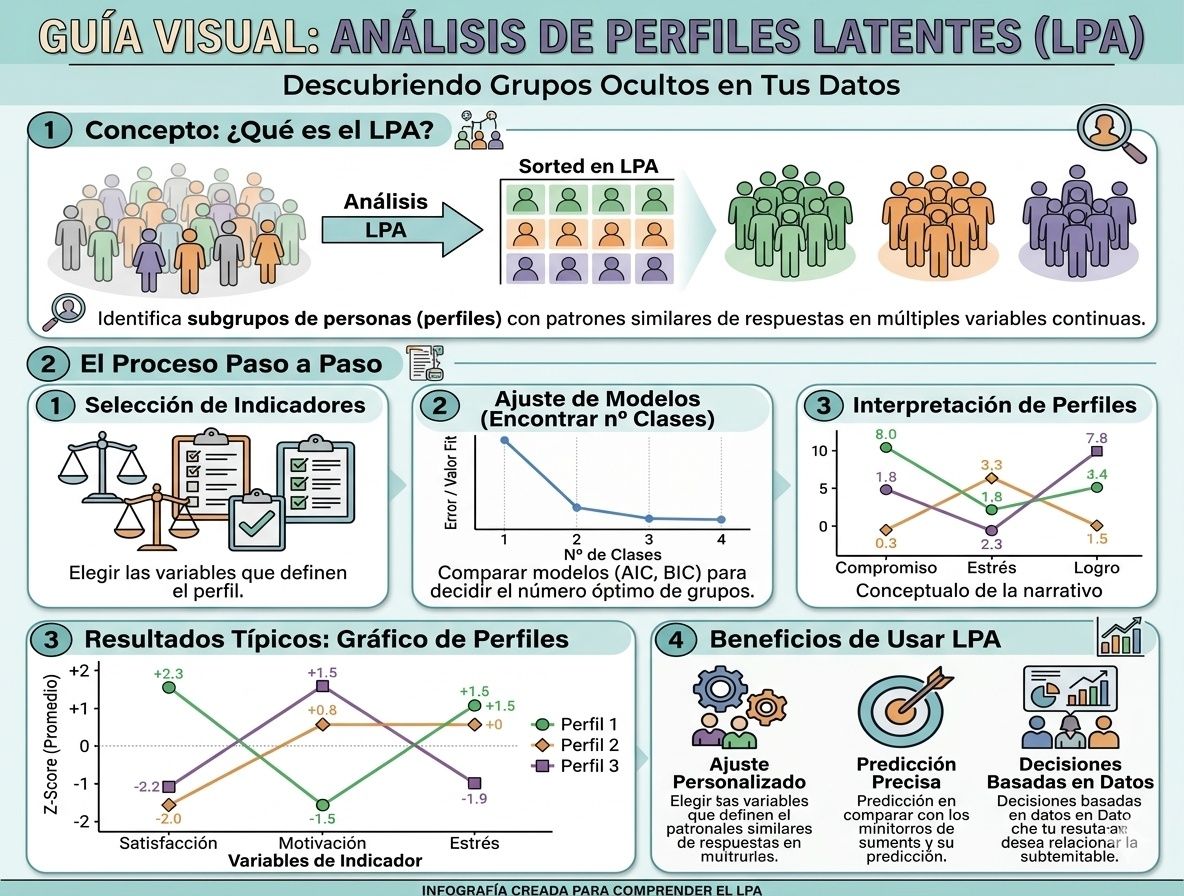 A veces, las medias y las correlaciones generales nos cuentan una historia incompleta. En la vida real, las personas no se comportan de forma lineal, sino que se agrupan en perfiles con características únicas. Ahí es donde entra en juego el Análisis de Perfiles Latentes (LPA).