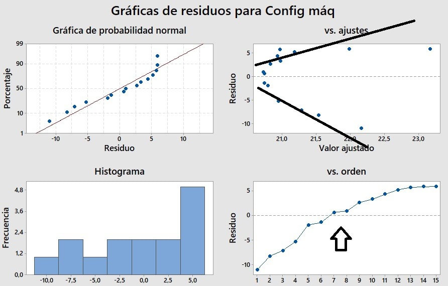 Respecto a la comprobación de los supuestos del modelo, con los Gráficos 4 en 1 del botón ‘Gráficas‘ del submenú del modelo lineal general del ANOVA. Previamente a la interpretación de resultados de la Tabla ANOVA, es necesario validar los supuestos de partida del Análisis Estadístico, esto es Normalidad y Homocedasticidad de los residuos (varianza constante, que se puede apreciar en la segunda gráfica en horizontal de valor ajustado, si los datos tienen forma de altavoz-megáfono se puede intuir un problema respecto a este supuesto, que habrá que comprobar analíticamente con la prueba de esfericidad de Bartlett), así como independencia y aleatoriedad de los errores, cuyo cumplimiento queda fuera de lugar ante una situación como la del 4º gráfico, lo más lejano a una gráfica de zig-zag de aleatoriedad en los residuos.