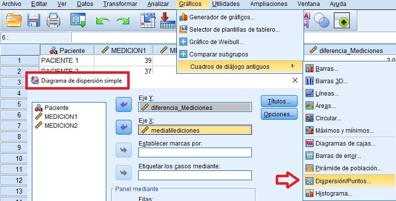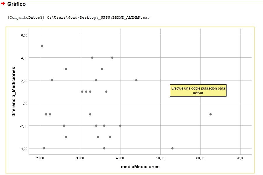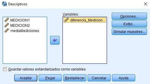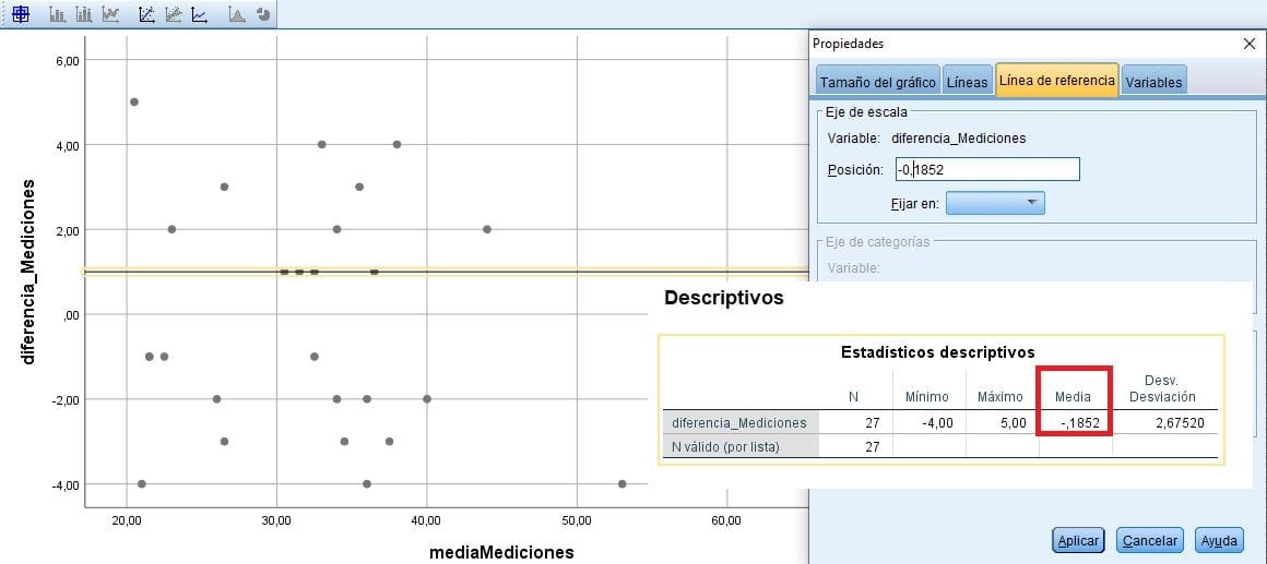 Doble clic en el gráfico de dispersión en la ventana de resultados-output del SPSS, para de esta manera poder activar y configurar el gráfico, en función de la media y desviación típica de las diferencias de las mediciones, que se pueden obtener de manera sencilla, a partir del comando ‘Descriptivos’ del menú ‘Analizar’::