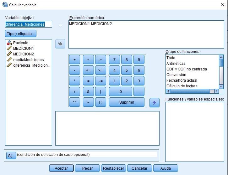 Se genera la variable media, como media aritmética de las 2 variables de medición numérica, y la variable diferencia de las mismas: