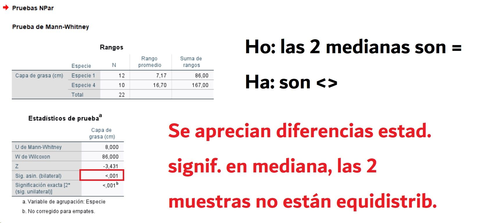 Comparativa de medianas o rangos promedio (¿se encuentran las 2 muestras idénticamente distribuidas?), siempre ante la violación del supuesto de normalidad.