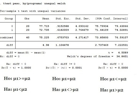 El Test de igualdad de medias con varianzas no homogéneas en Stata se realiza activando las casillas de verificación de varianzas desiguales y de aproximación de Welch. En función del p-valor y del tipo de contraste, se rechaza o no la hipótesis nula de igualdad de medias.