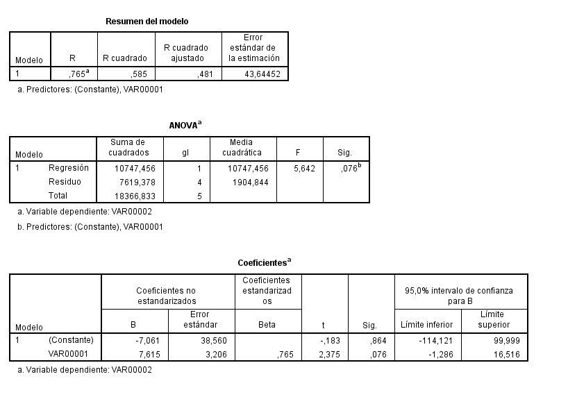 Además de que lo que se pretende es encontrar un modelo de ajuste para predecir la relación lineal existente entre la variable dependiente Y, y la independiente X, conviene estudiar los índices para cuantificar dicha relación lineal (R cuadrado o coeficiente de determinación de bondad del ajuste), además del cálculo e interpretación de los coeficientes de la regresión (término independiente Bo, y pendiente de la recta B1).